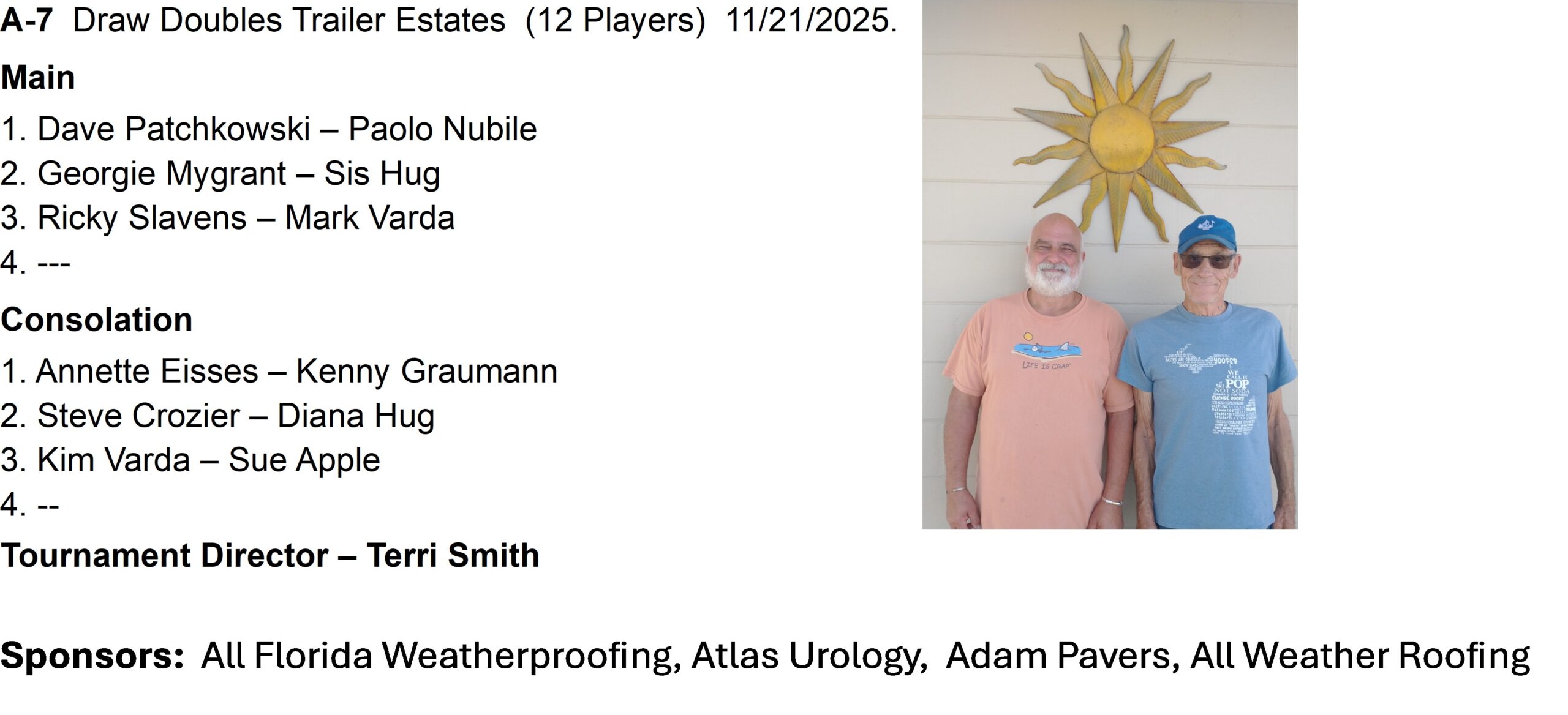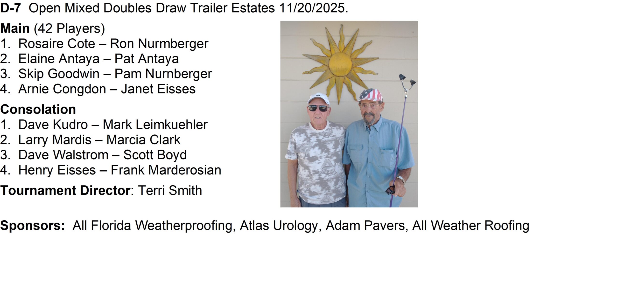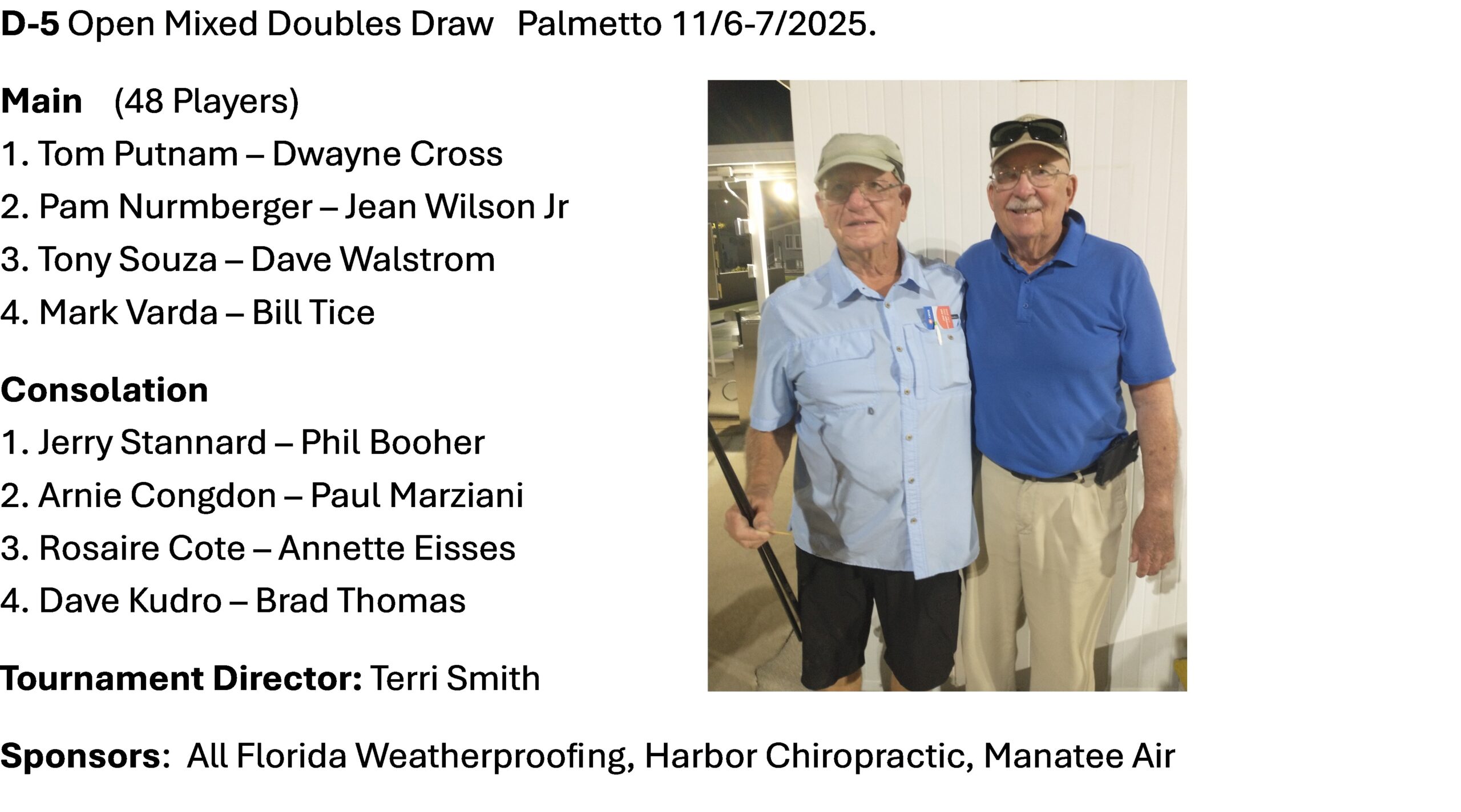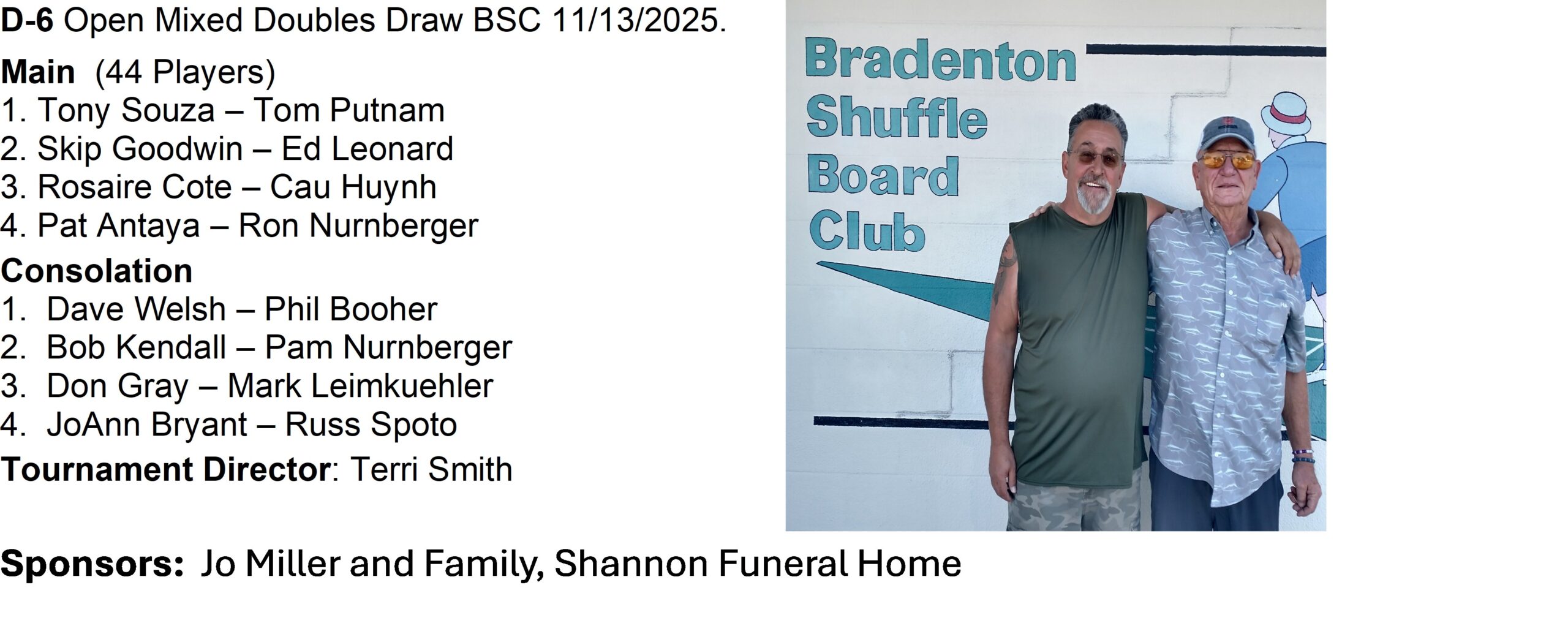 Thank you to our Sponsors:  Bryans Electric, McKinzie Pest Control, All Florida Weatherproofing, Family Doctors, Nissan of Bradenton, Oneco Barber Shop, Shannon Funeral Home, Budget AC, Wesco, Total Pest Control, Accurate Advisory Group, Harbor Chiropractic, Sewells Plumbing, and Mission BBQ.
